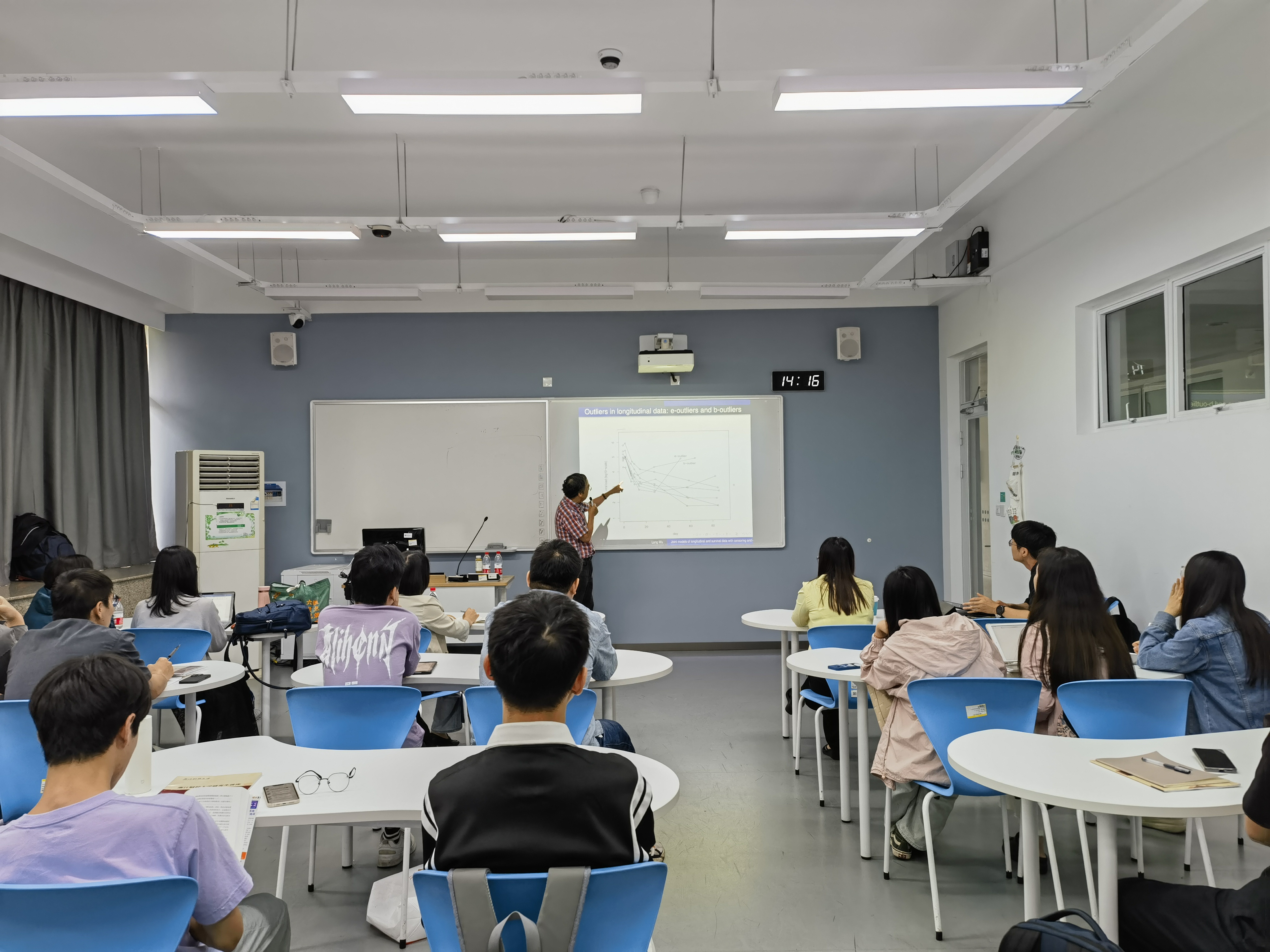 师生作题为“Joint models of longitudinal and survival data with censoring and outliers”的学术讲座。讲座由应用统计系主任周力凯主持,部分教师及研究生参加了此次讲座。