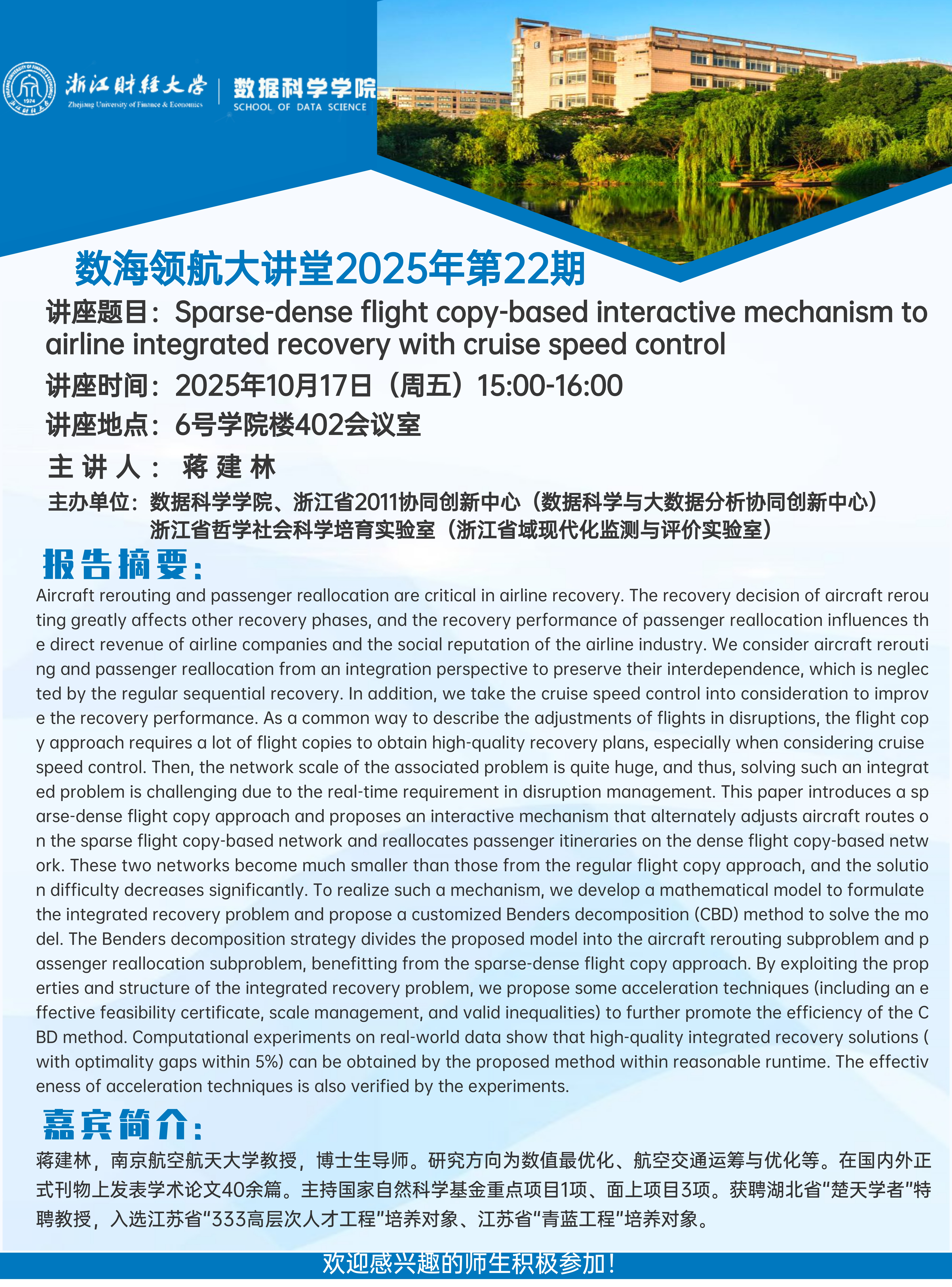 上一条:Sparse-dense flight copy-based interactive mechanism toairline integrated recovery with cruise speed control——数海领航大讲堂2025年第22期开讲 下一条:不同尺度复杂系统的网络建模及分析——数海领航大讲堂2025年第21期开讲