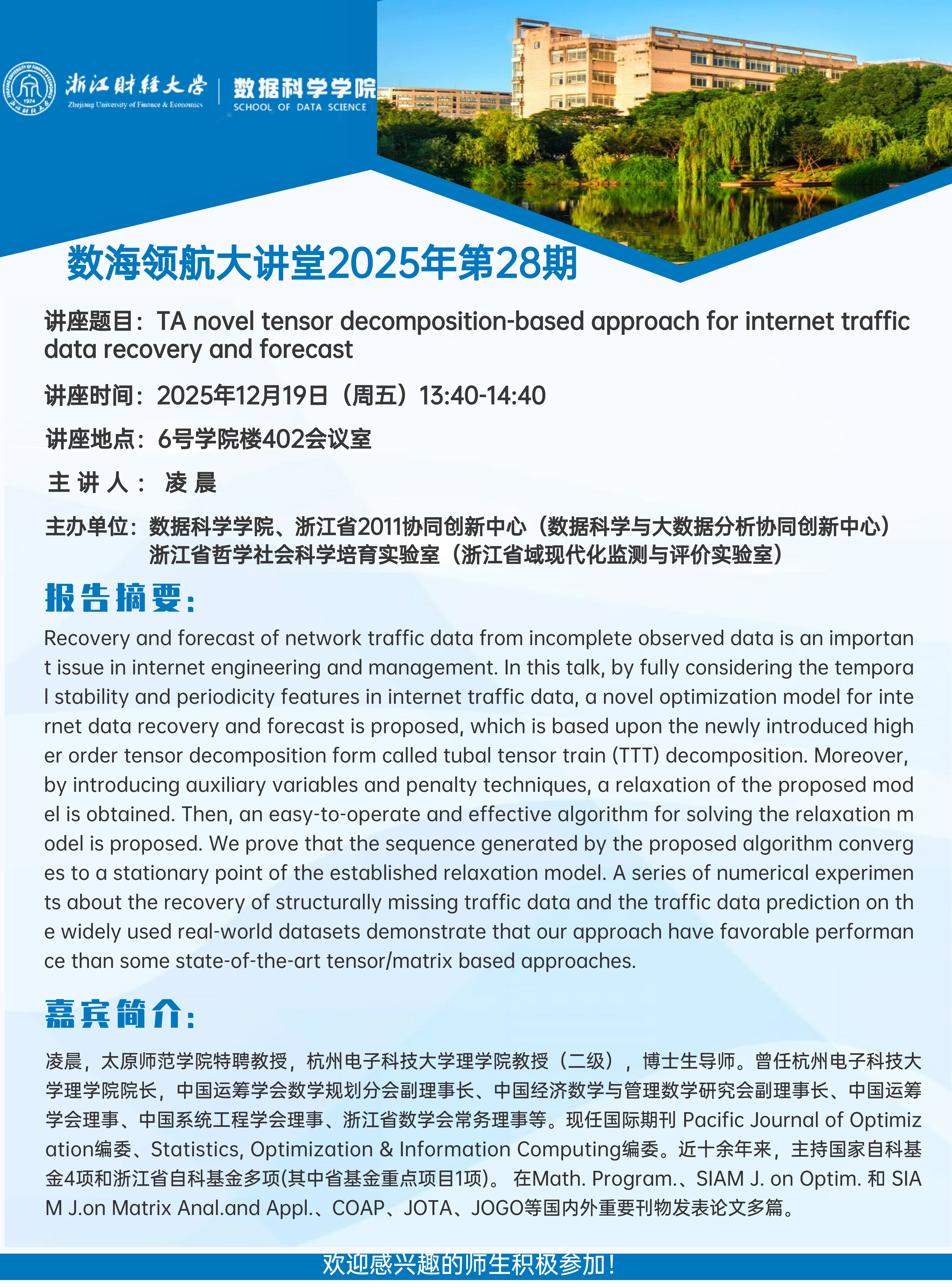 上一条:数海领航大讲堂2025年第29期——青岛大学杜守强教授 下一条:运用时间序列发现系统的动态行为:Takens'嵌入定理、统计推断与深度学习 ——数海领航大讲堂2025年第27期开讲
