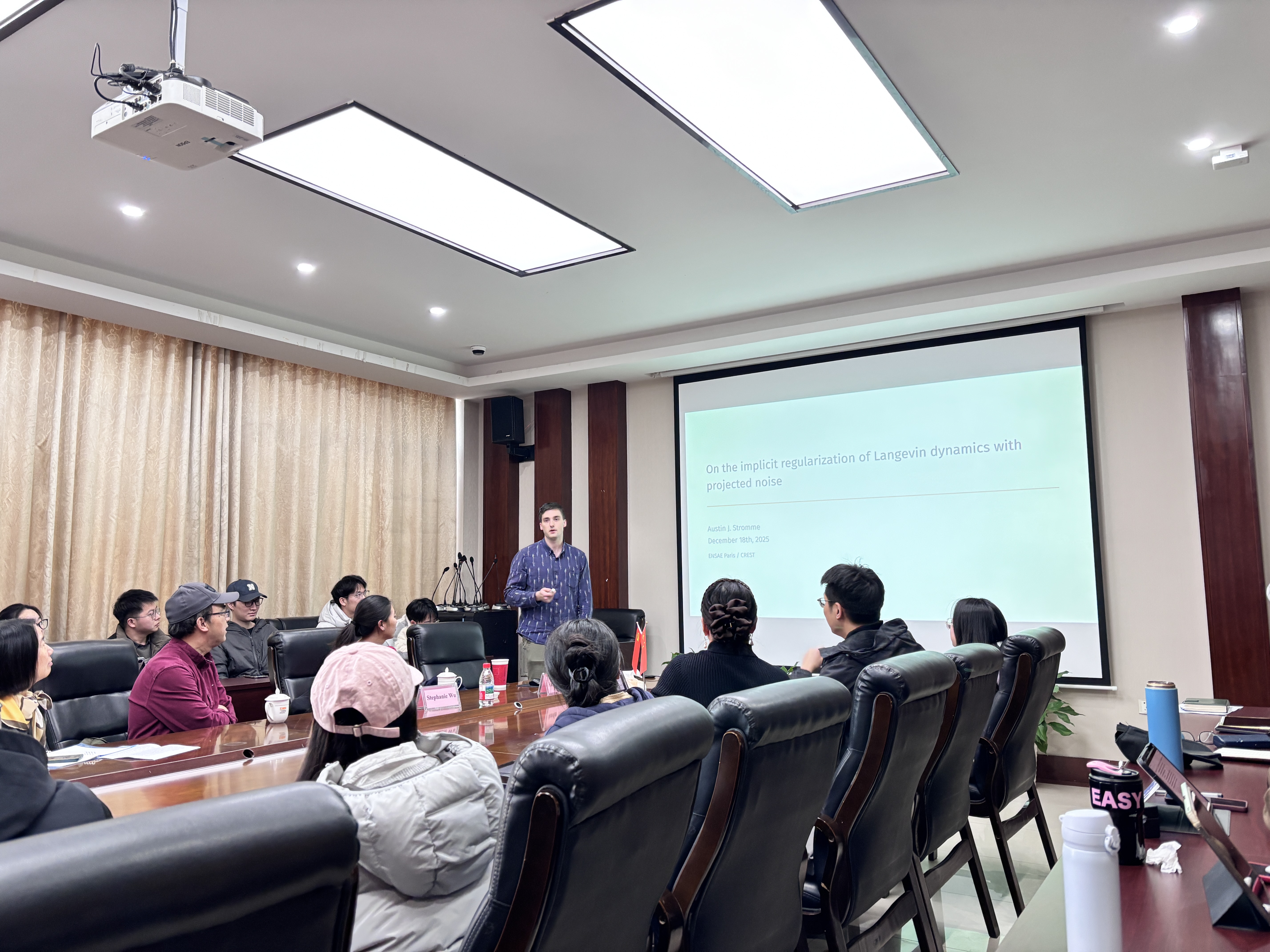 师生做了一场题为“On the Implicit Regularization of Langevin Dynamics with Projected Noise”的学术讲座。讲座由应用统计系主任周力凯主持,部分教师及研究生参加了此次讲座。