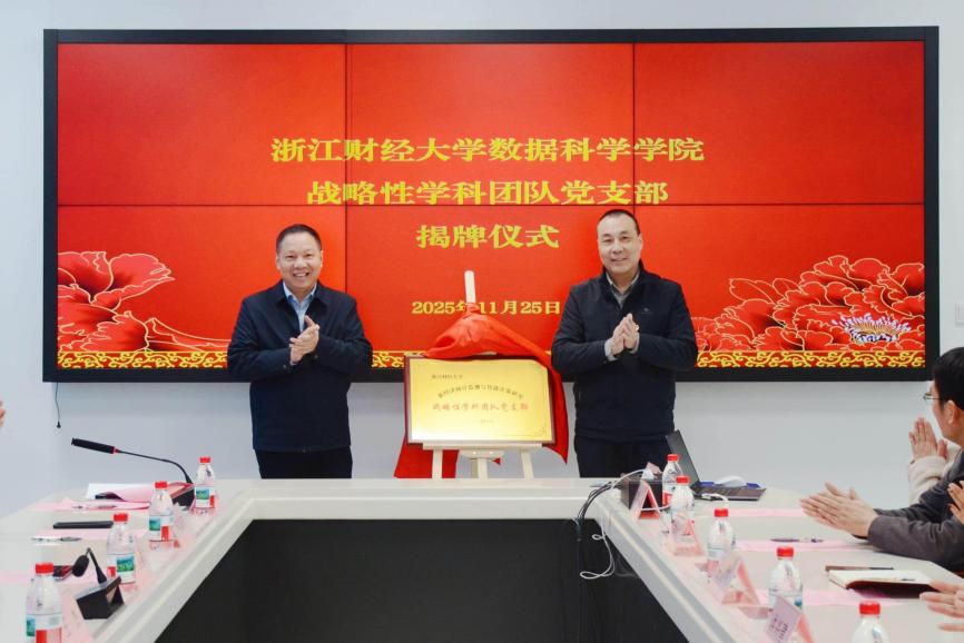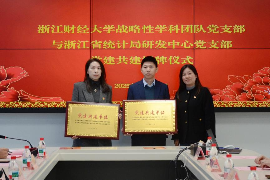 战略性学科团队党支部揭牌暨党建共建签约仪式在校图书馆举行。浙江省统计学会会长王杰,校发展委员会主席、团队党支部书记李金昌,校党委副书记程爽,校党委委员、组织部部长申屠莉,省统计局研发中心主任周琳等出席活动。