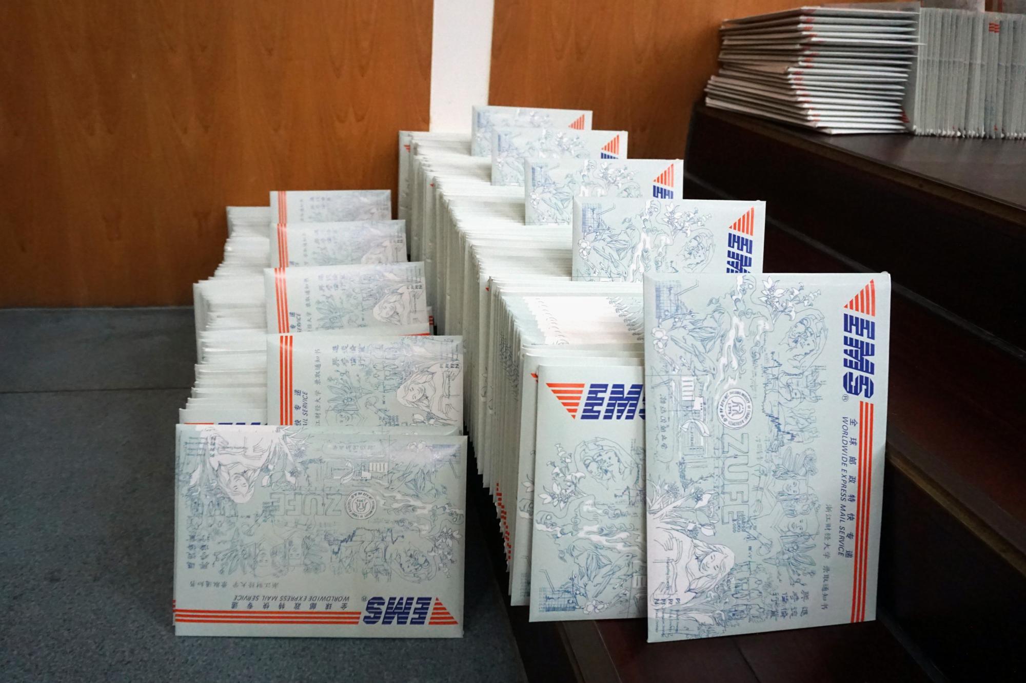 各本科生党支部共6名代表来到录取通知书分装和寄送工作现场,他们合理分工,以认真严谨的态度,经过3个多小时的紧张工作,完成了182份录取通知书的分装任务。