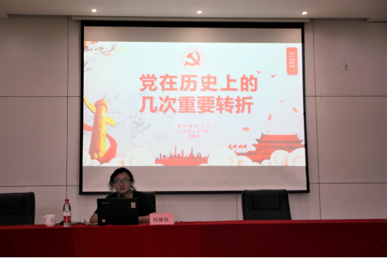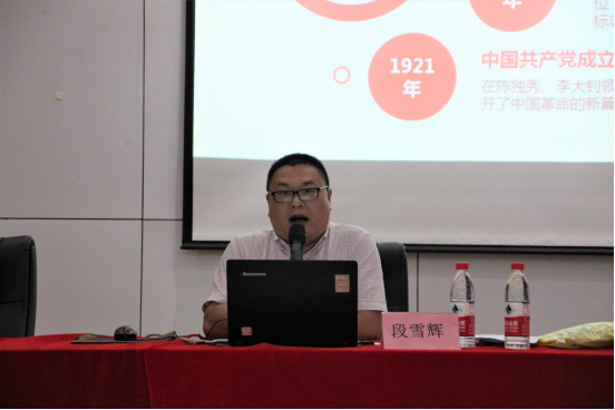 党史教育培训课上,马克思主义学院副院长邢雁欣讲诉中国共产党从政党诞生到南方谈话的几个重大历史转折,带领与会成员感悟党在紧要时刻做出重要选择的智慧与力量。