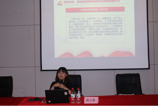 党史教育授课之余,由学生党员及预备党员分组进行的小组党史学习与思考的讨论,同样对于党员党史教育意义重大。在讨论中,成员们各抒己见,讲述着自己对于党史的思索与感悟,加深着对党和党员身份的意义认知。而在党课学习的结业典礼上,学生党员们进行主题发言,论述自己对于党史学习教育的感悟与心得。与此同时,全体与会成员庄严宣誓,传达自己坚守党的初心与传承党的使命的坚定决心。