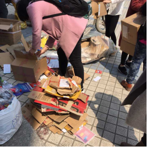 学生帮助收废品大叔一起整理废品