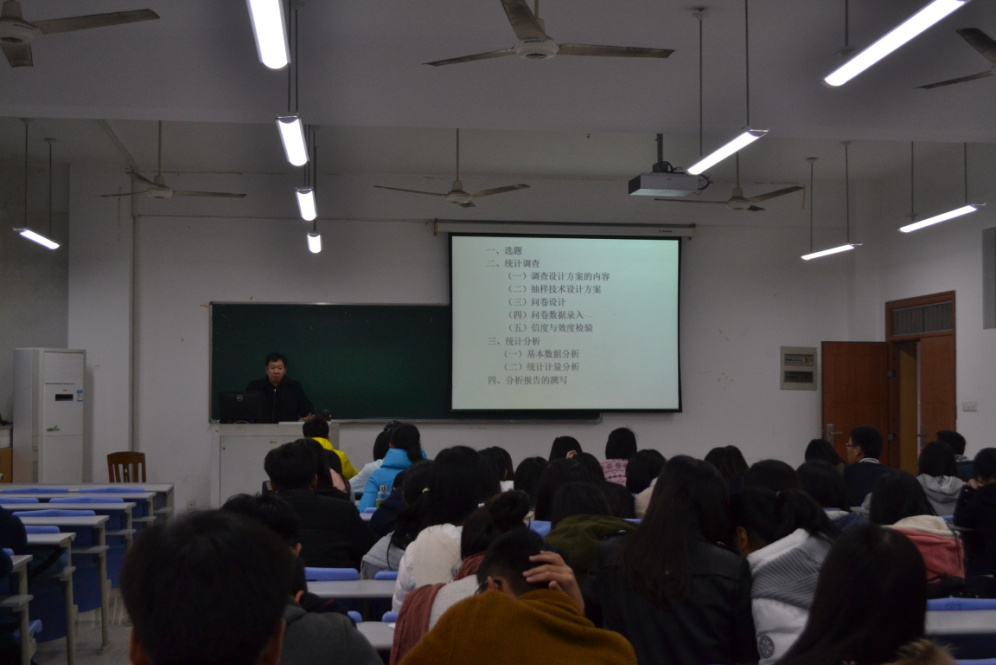 此次辅导会由统计系李时兴老师负责讲解,首先他分别从选题、统计调查、统计分析、分析报告的撰写四个部分,指导参加新生科研的同学如何进行课题研究。接着,他又从调查设计方案的内容、抽样技术方案、问卷设计、问卷数据录入、信度与效度检验、基本数据分析、统计计量分析七个小点出发,并用获奖优秀作品作为例子,仔细地给同学们讲解课题调研的整个过程。