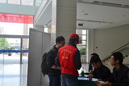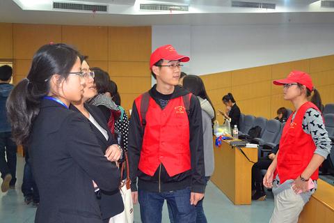 15日下午1时左右,选手开始陆续到来,志愿者们热情地迎接自己负责的参赛队伍,细心地带领他们办理报到手续并熟悉比赛场地。“这里是我们的PPT放映,这里是比赛的候场室。”志愿者一一为选手们介绍着。介绍结束之后志愿者们认真地帮助选手调试PPT确保比赛中万无一失的播放。有些团队准备完成后希望参观财大校园,志愿者们又不辞辛苦充当起校园导游的角色,整个校园里充满了红色的身影。一顶顶小红帽,折射出了志愿者最为真诚的关爱和甘于奉献的精神。