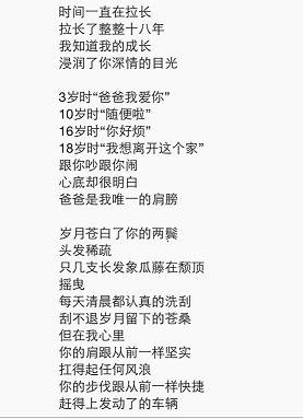 蔡丽同学拿起了铲子像模像样的烧起了菜,只为博父母一个欣慰的微笑。曾经衣来伸手饭来张口的男孩李晟杰、潘智军等也洗起了衣服拖起了地,只为让爸爸妈妈放心,放心以后在远方的他们也可以自己照顾自己。13数学班的向秋行,更是用两首简短的小诗表达了她对父母深深的爱。