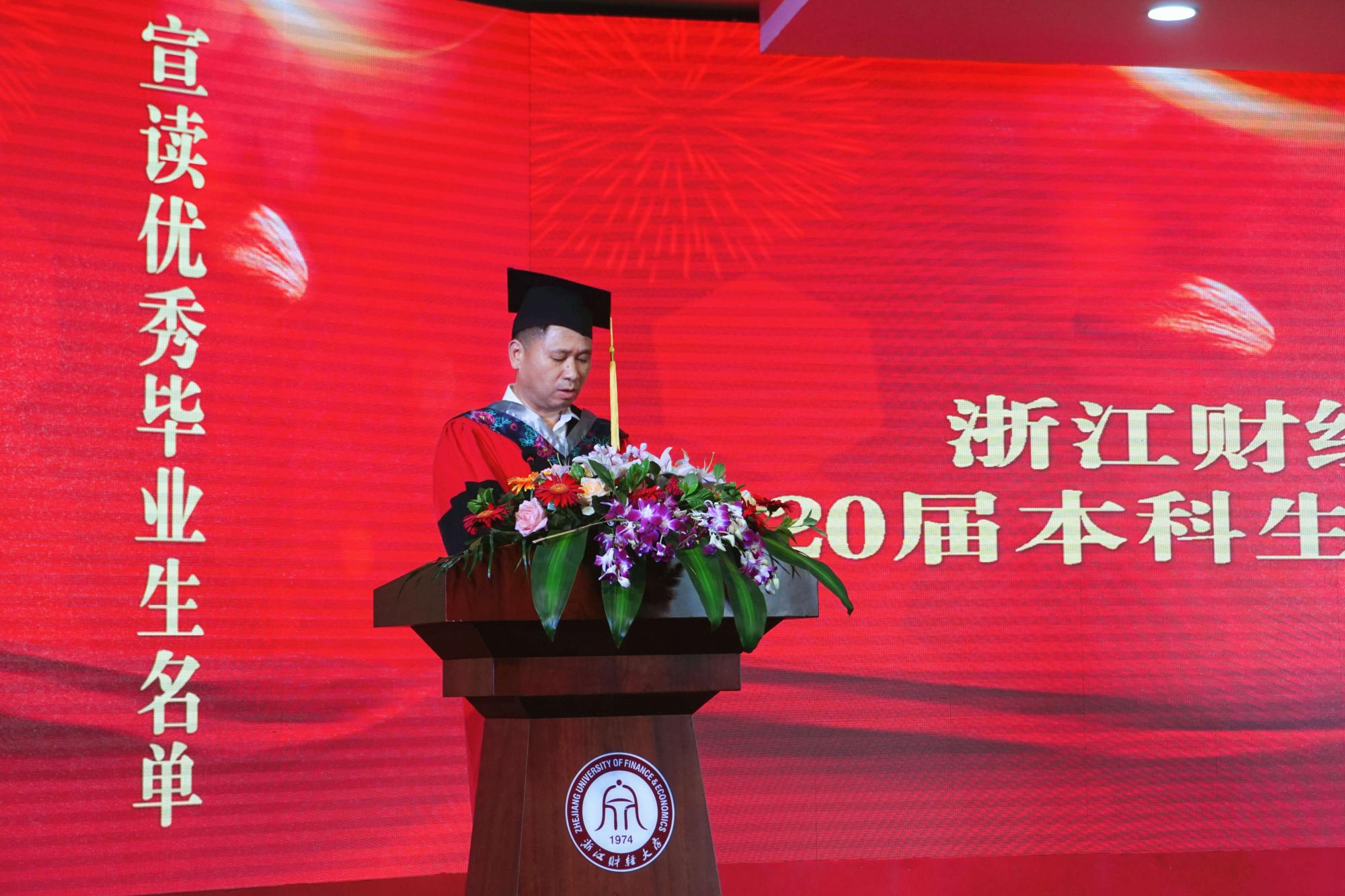 洪兴建院长宣读了学院获得浙江省优秀毕业生、校级优秀毕业生称号及考取国内外名校研究生的毕业生名单。随后,进行了隆重的学士学位颁授仪式,校领导、导师代表们上台为毕业生们拨穗,完成学位授予。在场的老师、同学们共同见证了这一庄严而喜庆的时刻。