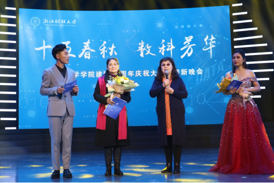 晚会上,师生献上了对唱《好大一棵树》,以优美的律动、轻柔的声调诉说着浓厚的师生情谊。在小品《烛芯》诉说退休教师最后一课的感人故事后,举行了隆重的教师荣休仪式。荣休教师热泪盈眶发表了感言,为新进教师佩戴校徽、新进教师为荣休教师献上鲜花,在新老互动中领悟传承着数科人教书育人代代传的奋斗精神。晚会还邀请了我校郭桢爱心基金发起设立者2010级校友郭桢父母来到现场,诉说了爱心基金设立和运行6年多来的感人故事,以现场思政教育的形式,激励数科人始终秉持一份感恩的心,感恩国家、感恩社会、感恩父母、感恩财大,勇担历史使命,做一个大爱之人。