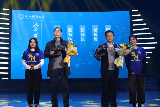 优秀学生代表为金牛奖获得者送上奖杯和鲜花