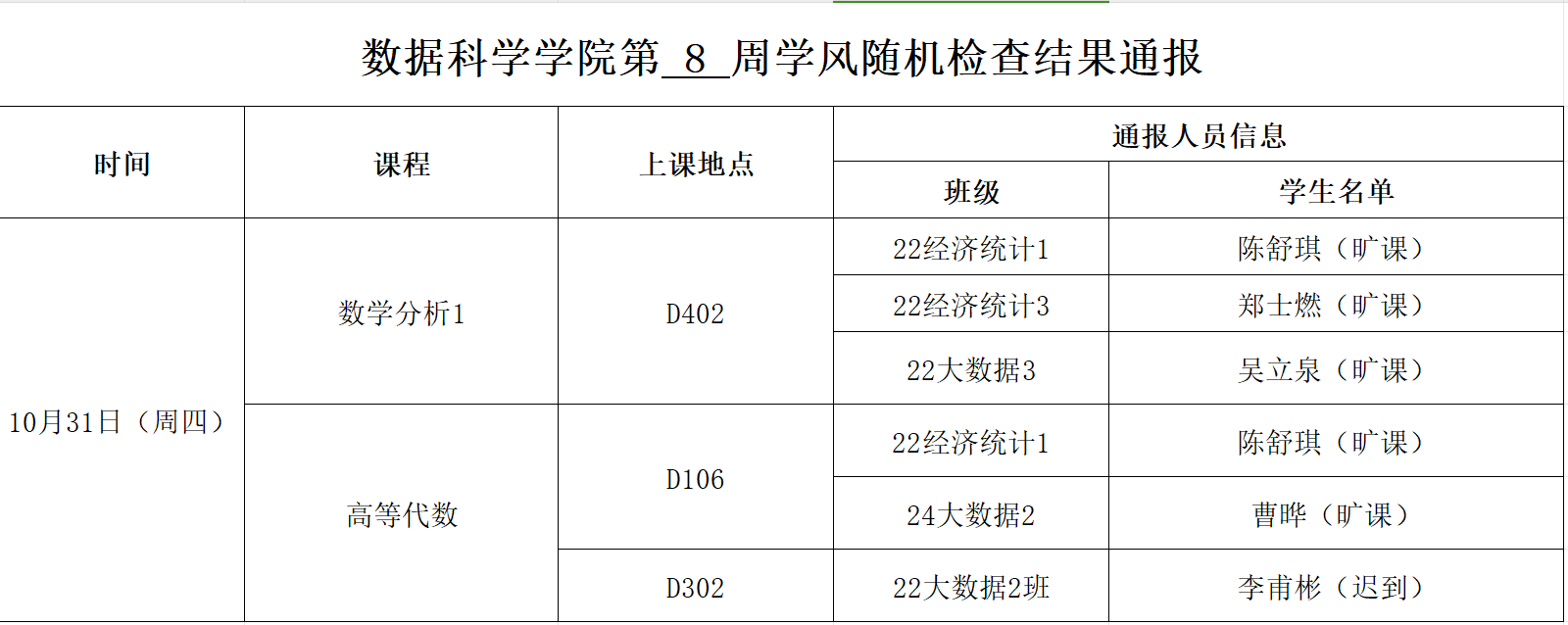 10月31日上午,成人短视频 开展学风督查,成人短视频 2024级新生辅导员徐翠、王彤彤、陈璐开展新学期学风第三次督查工作,对新生各班级课堂考勤、纪律及听课情况等进行随机检查。现将本次随机检查结果通报如下: