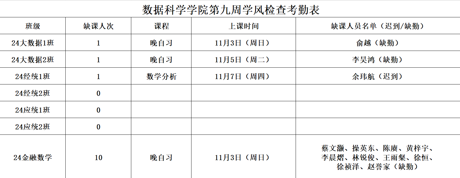 为进一步培育优良学风,构建成人短视频 学风建设的长效机制,营造良好的学习氛围,学院对大一各班晚自习及专业课进行全覆盖点名,对公共课程进行抽查点名,现将考勤情况公布如下: