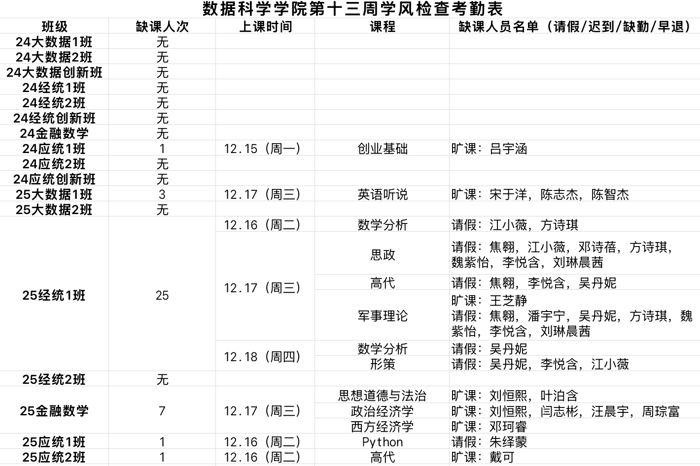 成人短视频 学生工作办公室开展第13周学风督察工作,对本科生各班级的学生前排就座情况,课堂考勤、纪律及听课情况等进行随机检查,现将本次随机抽查结果通报如下:
