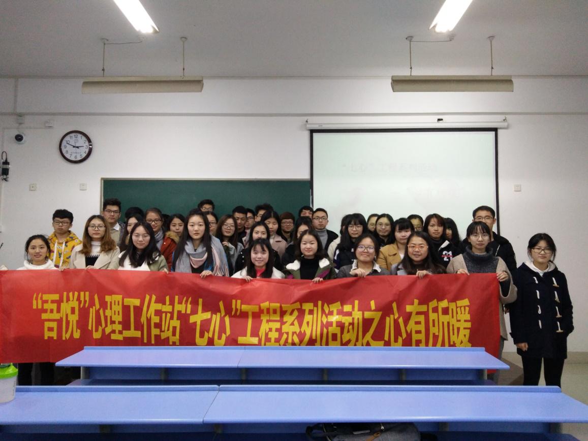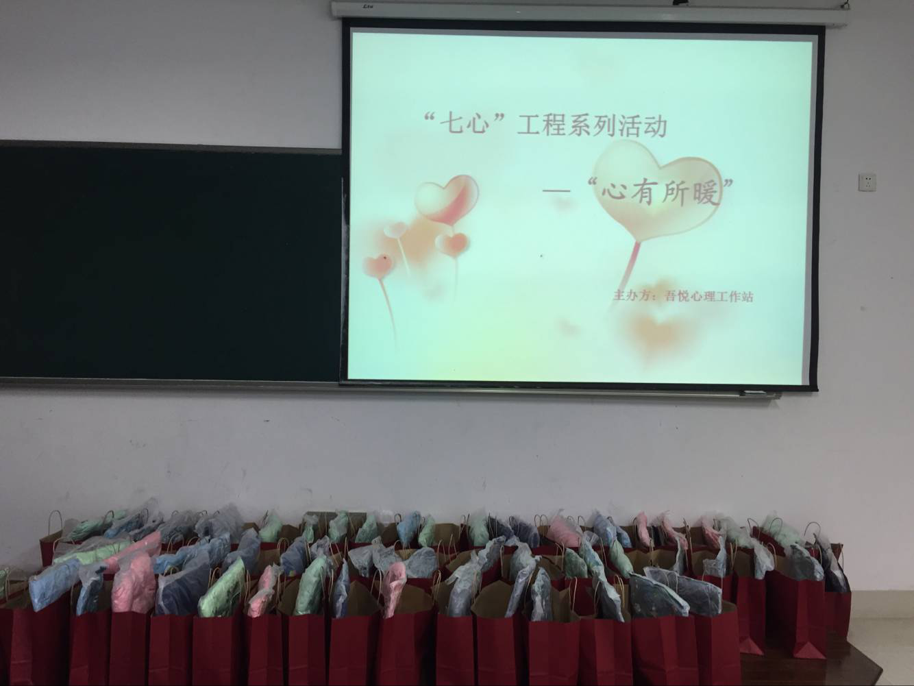 “吾悦”心理工作站于B106成功举办了“心有所暖”活动。此次活动的主要目的有慰问贫困生、了解同学们的职业规划两项。活动邀请了学院中学习成绩优异的同学分享学习心得。活动最后,江挺老师为活动进行了总结,并为每位同学献上精心准备的“冬日大礼包”。