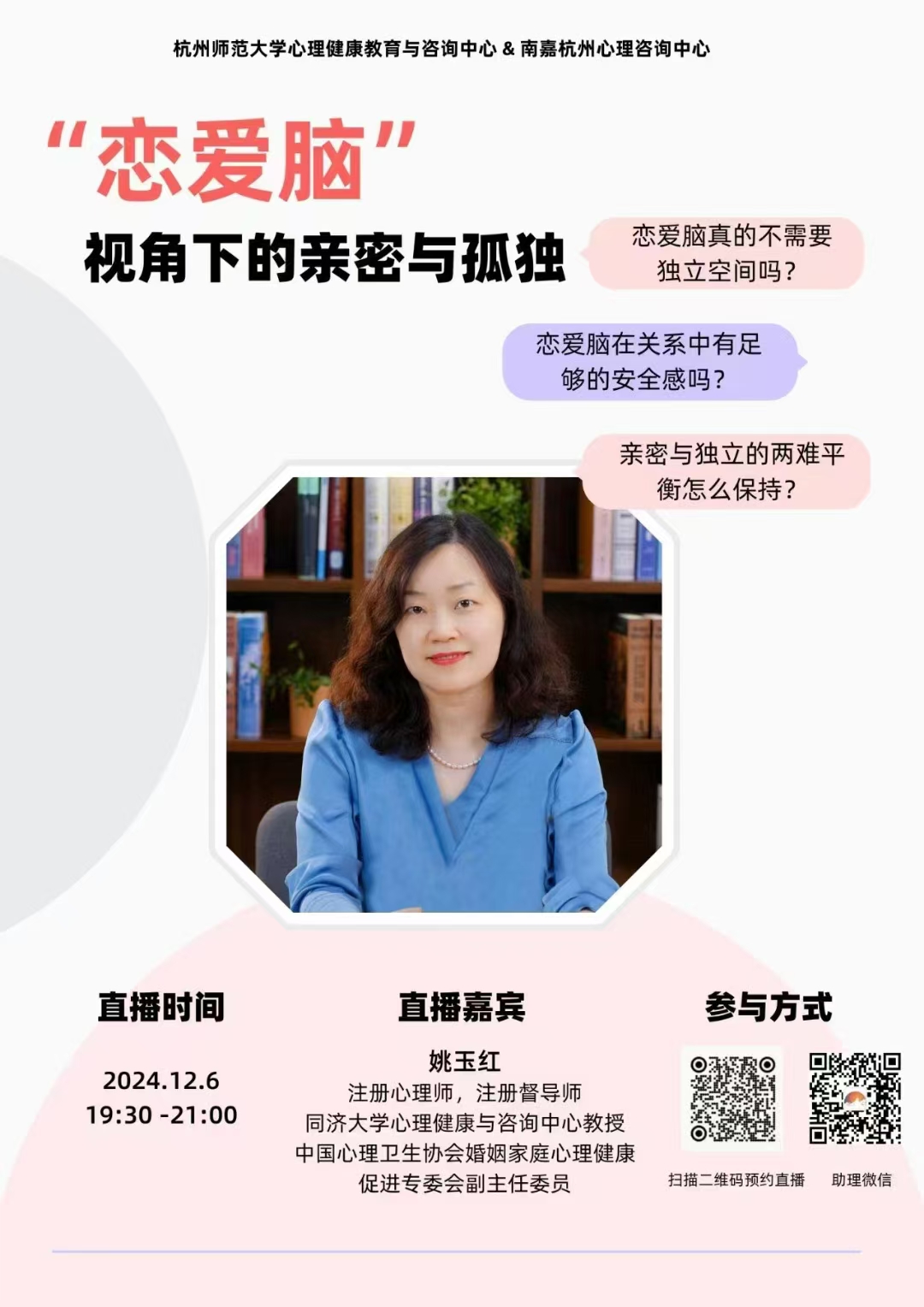 杭州师范大学心理健康教育与咨询中心&南嘉杭州心理咨询中心将举办一场关于“恋爱脑”的直播活动。