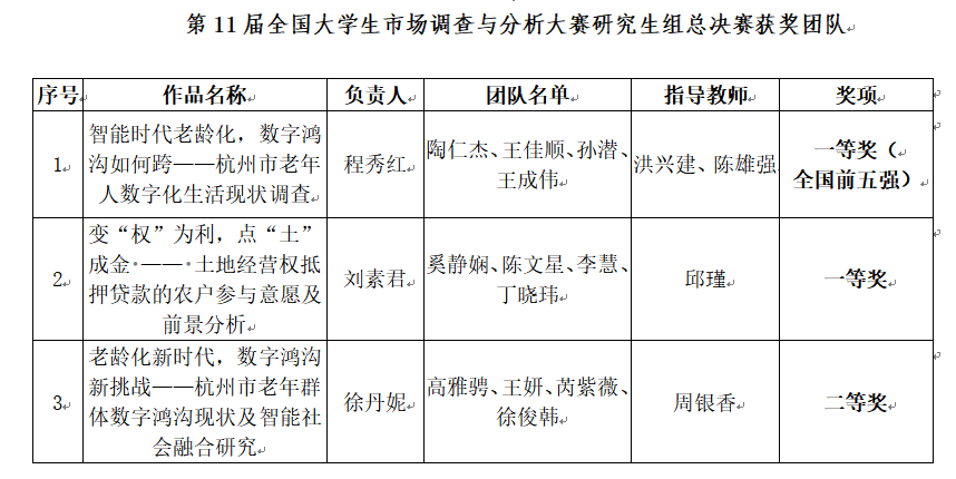5月15-16日,由教育部高等学校统计学类专业教学指导委员会与中国商业统计学会共同主办,云南大学协办的“第11届全国大学生市场调查与分析大赛研究生组总决赛”在昆明落下帷幕。研究生第一党支部成员程秀红主持的《智能时代老龄化,数字鸿沟如何跨——杭州市老年人数字化生活现状调查》入围全国前五强,荣获一等奖的佳绩,党支部成员王妍、芮紫薇参与的《老龄化新时代,数字鸿沟新挑战——杭州市老年群体数字鸿沟现状及智能社会融合研究》荣获二等奖佳绩。