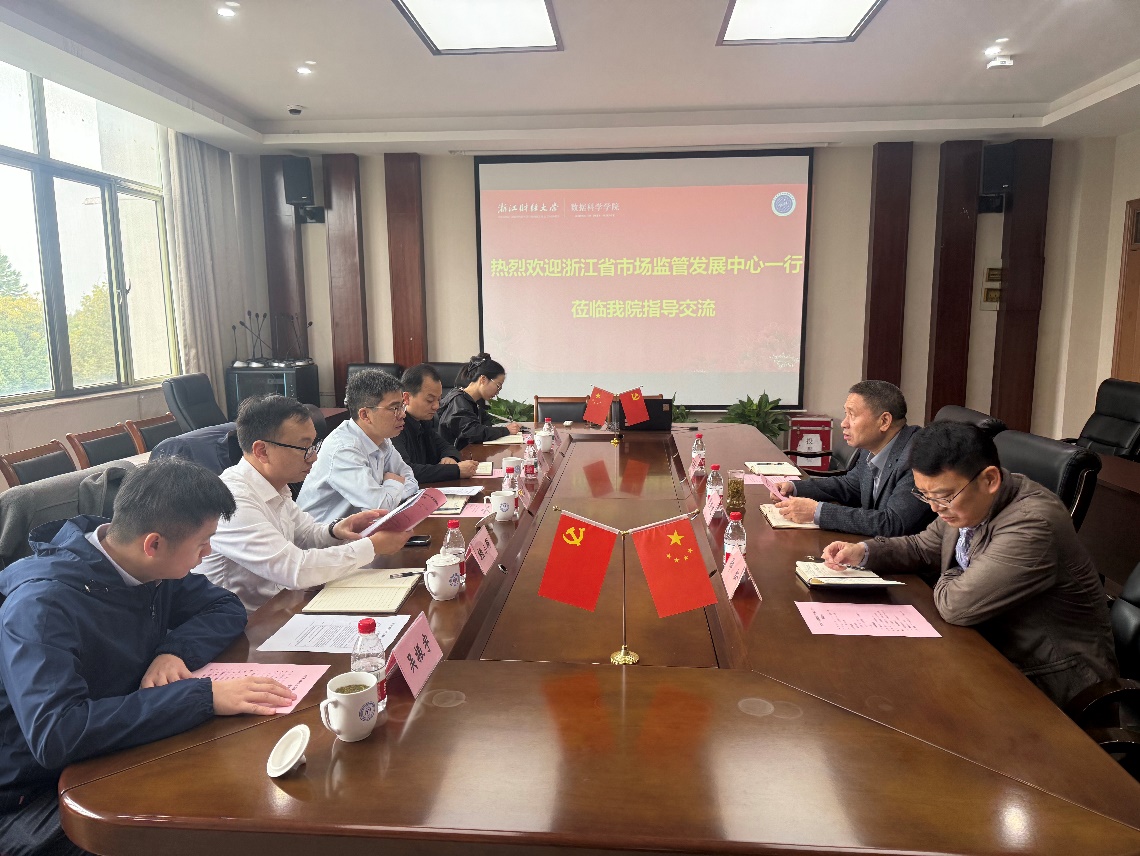 调研交流。会议在学院402会议室举行,双方就实验室的申报、建设与管理经验开展调研交流。浙江省市场监管发展中心副主任方道广、综合研究部部长赖小科、党群人事部副部长张涛、研究人员顾妮,数据科学学院院长洪兴建、副院长郑松、党政办公室主任张学成出席了此次会议,会议由学院院长洪兴建主持。