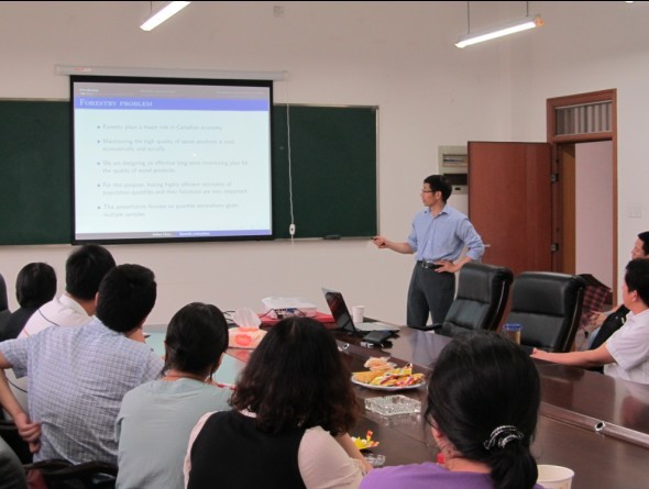陈家骅教授现任英属哥伦比亚大学统计系终身教授。在顶级统计学期刊如JASA, JRSSB等上发表论文70余篇。任多个具有影响力的国际统计期刊的主编或者副主编,如Canadian Journal of Statistics的主编,曾获加拿大统计协会年度大奖CRM-SSC Prize等多项学术荣誉。报告会上,陈教授介绍了比率模型下分位数和分位数函数的估计。陈教授首先介绍了分位数估计模型提出的背景,引入了比率模型及经验似然估计方法,并证明了估计的参数的渐近正态性。其次,陈教授介绍了Barhadur 表示,将分位数中过程与经验过程联系起来。最后,陈教授比较了新模型与原先模型,并给出了具体的应用。