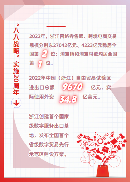国际循环质量水平快速提升。浙江外贸进出口总值从2002年的3472亿元增至2022年46837亿元,年均增长13.9%,从2002年的全国第五位先后超过北京、上海跃升至2022年的第三位。其中,出口从2434亿元增至34325亿元,年均增长14.1%,自2011年连续12年居全国第三位。创建首个国家级数字服务出口基地,发布全国首个省级数字贸易先行示范区建设方案。2022年,浙江服务贸易进出口5091亿元,居全国第一方阵,是2015年的1.8倍。