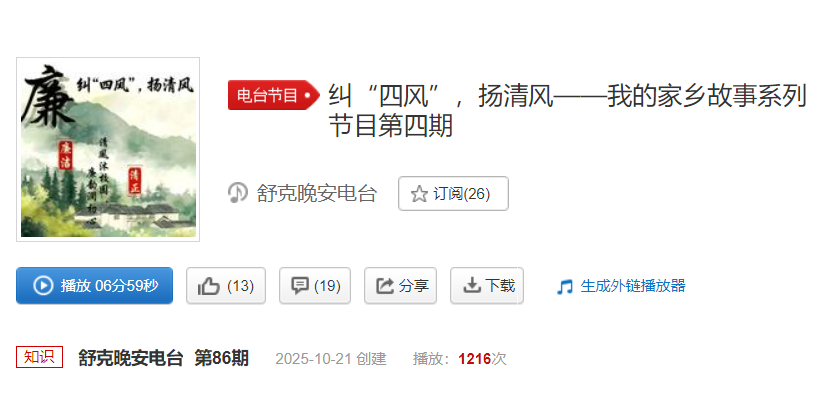 ,“舒克晚安电台”最新推出的“家乡清风故事”系列节目,将师生们在暑期社会实践中采集的基层故事转化为温暖声波,累计收听量已突破4000次,让清风乡韵真正“声”入人心。